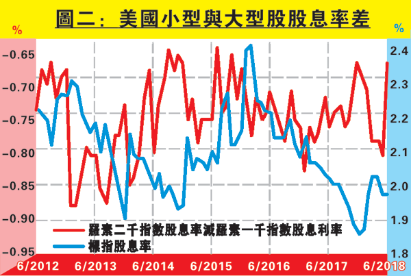再參考股息率。圖二可見其實小型股與大型股的股息率差異不大,近月兩者差距更見收窄。雖然美股不像港股那麼多殼股,但仍最好避免選擇完全不派息的個股,提防誤選供炒家炒殼的個股。