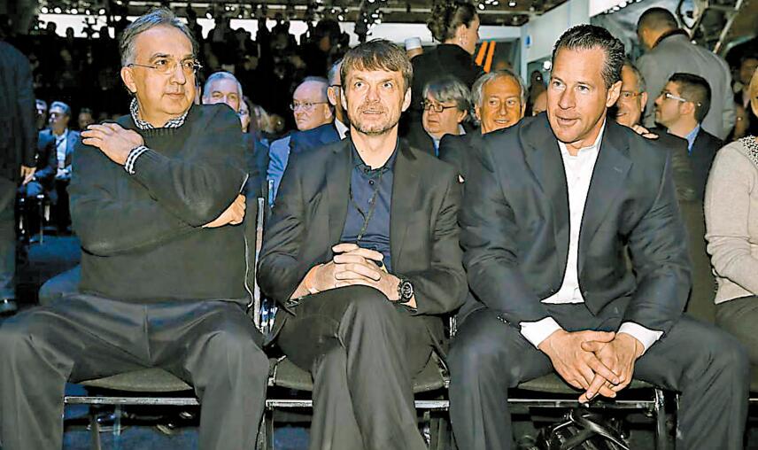 快意佳士拿宣布,任命公司資深主管曼利(中)接替馬爾基翁內(左)擔任CEO,並即時生效。圖為2人去年出席美國底特律車展。 資料圖片