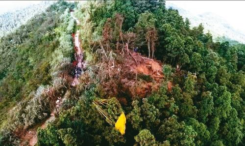 F-16战机坠毁地点,现场满目疮痍。台湾联合报/台湾新北市消防局影片截图