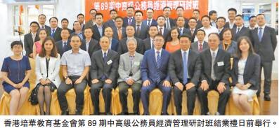 【香港商報网訊】記者張芃芃報道:香港培華教育基金會第89期中高級公務員經濟管理研討班結業禮日前假中總舉行,40名來自重慶政府相關部門的學員獲頒結業證書。在短短12天的學習中,學員們聽取了管理知識、經濟政策等方面的講座,參觀了香港相關政府部門、科學園、博物館等地。培華基金會常委兼公開組副主任王達,京港人才交流中心總經理彭明、項目經理劉亞輝,香港科技大學工商管理學院副院長徐岩等出席結業禮。