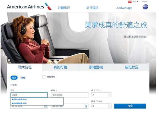 经验证,发现在美航官网出发地和目的地输入“Taipei”后,只显示台北桃园机场和台北松山机场,机场描述没有加“台湾”。此前,在机场描述后有“台湾”字样。不过,在出发地和目的地下拉列表中,仍有“台湾”选项。
