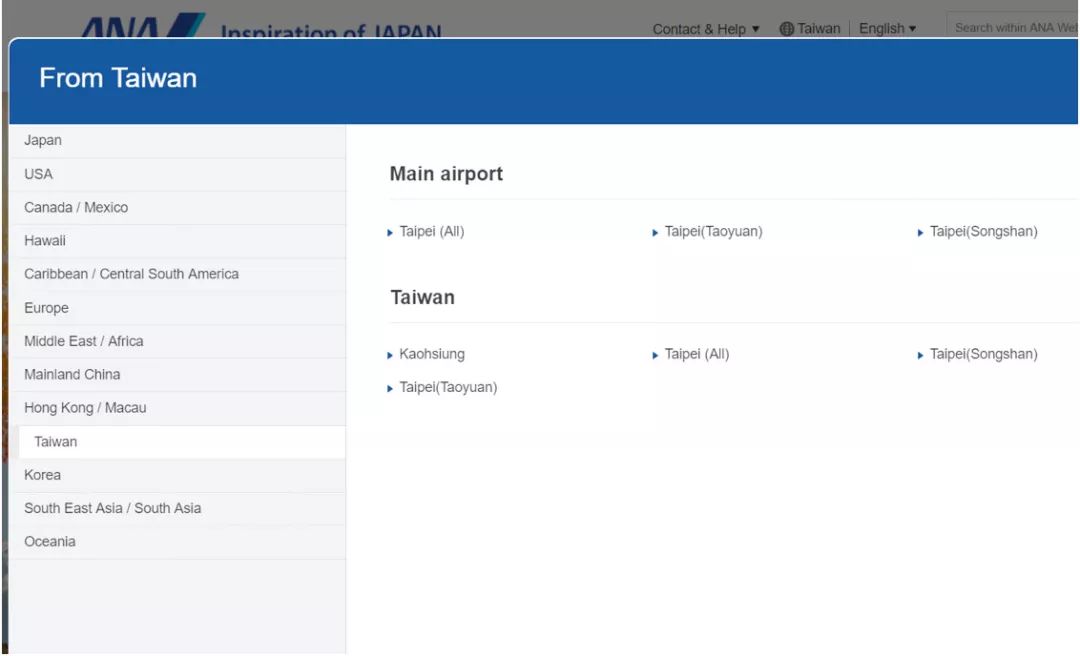 日航与全日空两家日本公司仅在网站的中文简体页面将台湾表述为“中国台湾”,面向台湾用户的繁体中文网页和英文、日文网页上,台港澳则和中国大陆在列表中并列呈现。