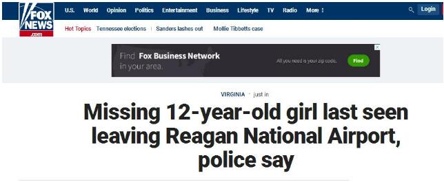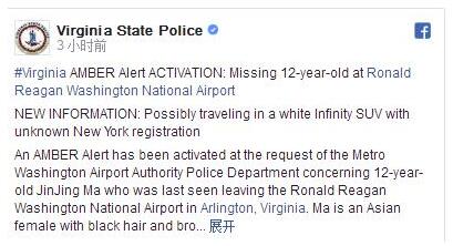 【环球网报道记者赵衍龙】弗吉尼亚(Virginia)警方当地时间2日下午发布一则安伯警报(美国儿童安全警报系统)认为,“一名来自中国的12岁女孩马金晶(Jinjing Ma,音译)在华盛顿里根机场(DCA)遭人绑架”,处境危险。