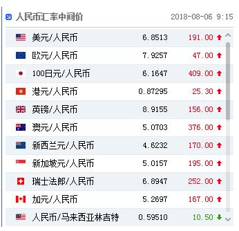 【香港商报网讯】据新浪财经,8月6日,人民币中间价报6.8513,上一交易日中间价报6.8322,下调191点,至2017年5月31日来最低,在岸人民币上一交易日收报6.8620。