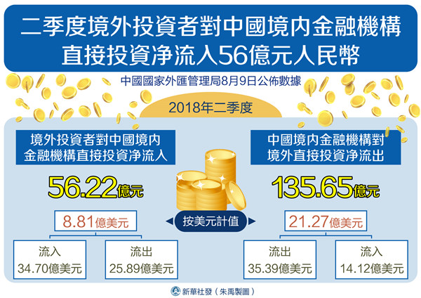 按美元計值,2018年二季度,境外投資者對中國境內金融機構直接投資流入34.70億美元,流出25.89億美元,淨流入8.81億美元;中國境內金融機構對境外直接投資流出35.39億美元,流入14.12億美元,淨流出21.27億美元。