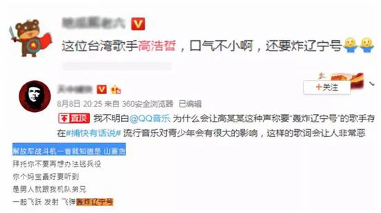 辽宁舰是解放军第一艘航空母舰。但微博网友8月8日发现,台湾歌手高浩哲在歌词中写“轰炸辽宁号”,疑似“诋毁解放军”,引发不小争议。