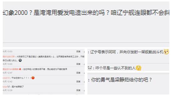 “解放军战斗机一看就知道是山寨货”;“一起飞跃 发射 飞弹轰炸辽宁号”。