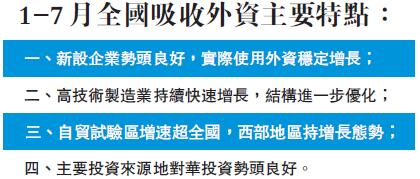 談及1-7月全國吸收外資的主要特點,朱冰表示,新設企業勢頭良好,實際使用外資穩定增長。朱冰告訴記者,1-7月全國新設立外商投資企業35239家,同比增長99.1%;實際使用外資4967.1億元人民幣,同比增長2.3%(折760.7億美元,同比增長5.5%)。7月當月全國新設立外商投資企業5648家,同比增長113.1%:實際使用外資504.2億元人民幣,同比增長14.9%(折77.5億美元,同比增長19.3%)。