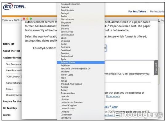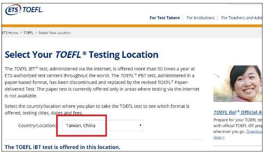 登上“托福网络测验”考试报名网站后,进入“注册考试”(Register for the Test)页面,就能看见上面清晰写着“查询你的地区”(check your location),在国家/地区(Country/Location)选项中,就会找到“中国台湾”(Taiwan, China)选项。