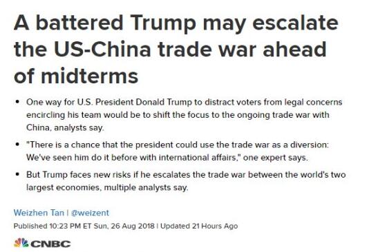 有专家对CNBC分析称,特朗普可能会利用升级中美贸易战的契机来转移选民注意力,并表示特朗普以前就在国际事务中使用过这种手段。