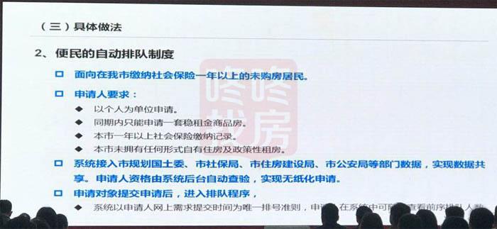 2、便民的自动排队制度。有面向对象的要求,即在深圳市缴纳社会保险一年以上的未购房居民,可以以个人为单位申请,同期内只能申请一套稳租金商品房,本市一年以上社保缴纳记录,本市未拥有审核形式自有住房及政策形成租房。系统接入规土委、社保局、住建局、公安局等部门数据,实现工具共享,申请人资格由系统后台自动查验,大家只需要输入身份证号,后台会自动查验你是否符合租房要求。申请提交后进入排队程序,以晚上提交时间为唯一的排号准则,先到先得。