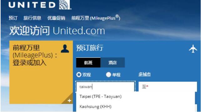 美联航官网主页,搜索“taiwan”显示台北、高雄等城市。