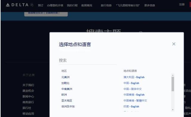 达美航空公司在选择语言一栏中,只有中国-English、中国-简体中文、中国香港- English和中国香港-繁體中文。