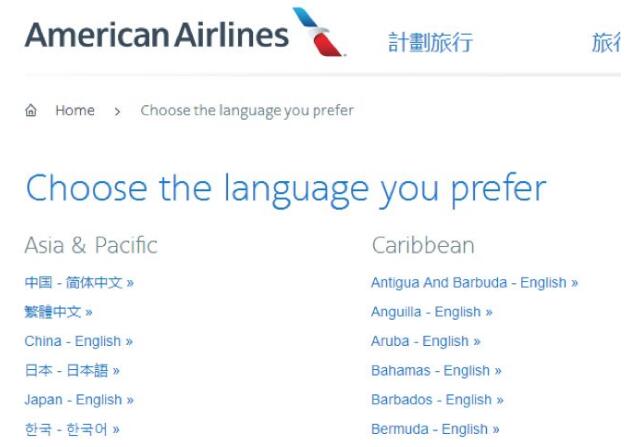 美国航空公司语言栏中,也只有简体中文、繁体中文及英语标注。