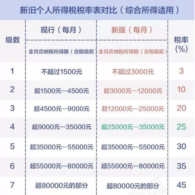 从上表可以看到,从月纳税所得额35000开始往上的累进税率新规和现行是一样的,变化的主要是月纳税所得额为35000元以下的几个等级,有所上调。
