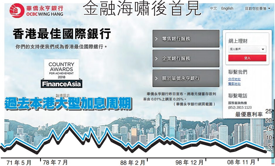 面對資金成本上升,銀行未有上調最優惠利率,但就有中小銀行率先上調儲蓄存款利率,華僑永亨銀行將於今日起,上調港元儲蓄存款利率,此為該行十年來首次上調儲蓄存款利率。