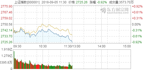 【香港商报网讯】沪深两市今日低开,随后沪指震荡走弱,创业板早盘一度翻红,可惜持续性不佳,临近午盘,三大指数出现跳水走势,加速下挫。截止午间收盘,沪指报2725.26点,跌幅0.92%,深成指报8473.36点,跌幅0.95%;创指报1444.92点,跌幅0.73%。