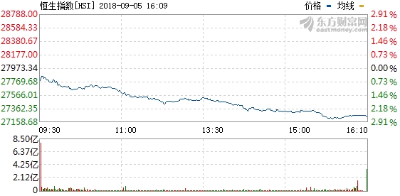 【香港商报网讯】9月5日消息,周二,欧美股市全面收跌,拖累港股ADR走势偏软。同时,美元指数走强,黄金及基本金属出现全面下挫。港股ADR收报27760点或跌212点或0.76%。今日开盘,恒指低开,此后跌幅大幅扩大。截至收盘,恒指跌2.61%,报27243.85点,日内跌729点;国企指数跌2.25%,报10645.7点;蓝筹股全面下跌,红筹指数跌2.23%,报4239.5点。大市成交951.97亿港元。