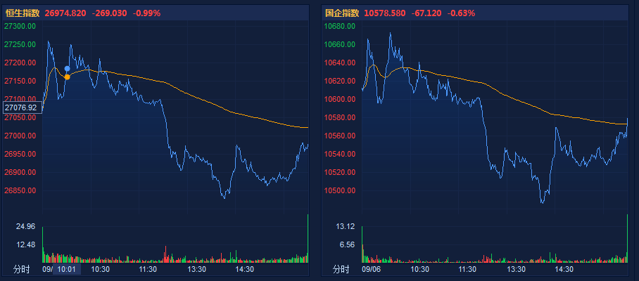 午后,港股加速跳水,恒生指数失守27000点关口,跌逾400点,盘中跌超1.5%,距年内33484高点跌近20%,几乎步入技术性熊市。恒指收盘跌1.0%至26974.82点。恒生国企指数跌超0.63%,盘中跌超1.4%。