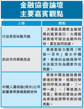 她認為,粵港澳大灣區是國家金融發展的重要窗口,對推動國家整體經濟的發展將發揮無可比擬的作用。在金融方面,務求讓粵港澳三地人民於區內的交通、購物、日常消費支付,以至一般銀行服務及理財皆能做到無縫對接。政府正積極研究的具體措施,包括簡化港澳居民在大灣區開立銀行戶口,以及研究容許香港的電子錢包在粵港澳大灣區內地城市使用。