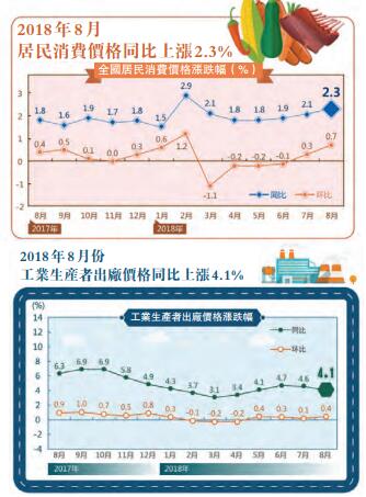 【香港商報网訊】國家統計局昨日發布的數據顯示,2018年8月份,全國居民消費價格(CPI)同比上漲2.3%;1-8月平均,全國居民消費價格比去年同期上漲2.0%。其中鮮菜和豬肉價格環比漲幅較大。另外,全國工業生產者出廠價格(PPI)同比上漲4.1%,環比上漲0.4%。