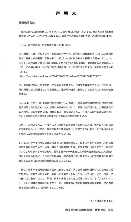 10日晚间,藤井实彦通过朋友的社交网络账号发表声明,声称没有踢踹慰安妇铜像,自己到达台南时因为长时间维持同样的姿势而有些气血不顺,脚部麻痹所以多次伸展,造成监控录像截取的情况。他还怀疑国民党加工照片并捏造,利用其作为“选战道具”。