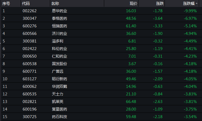 受第一批联合带量采购清单公布的消息影响,医药板块表现疲软,除恩华药业跌停之外,乐普医疗跌逾5%,爱尔眼科一度跌5%,泰格医药跌逾5%,上海医药跌近3%,科伦药业、仁和药业、济川药业等跌超4%。
