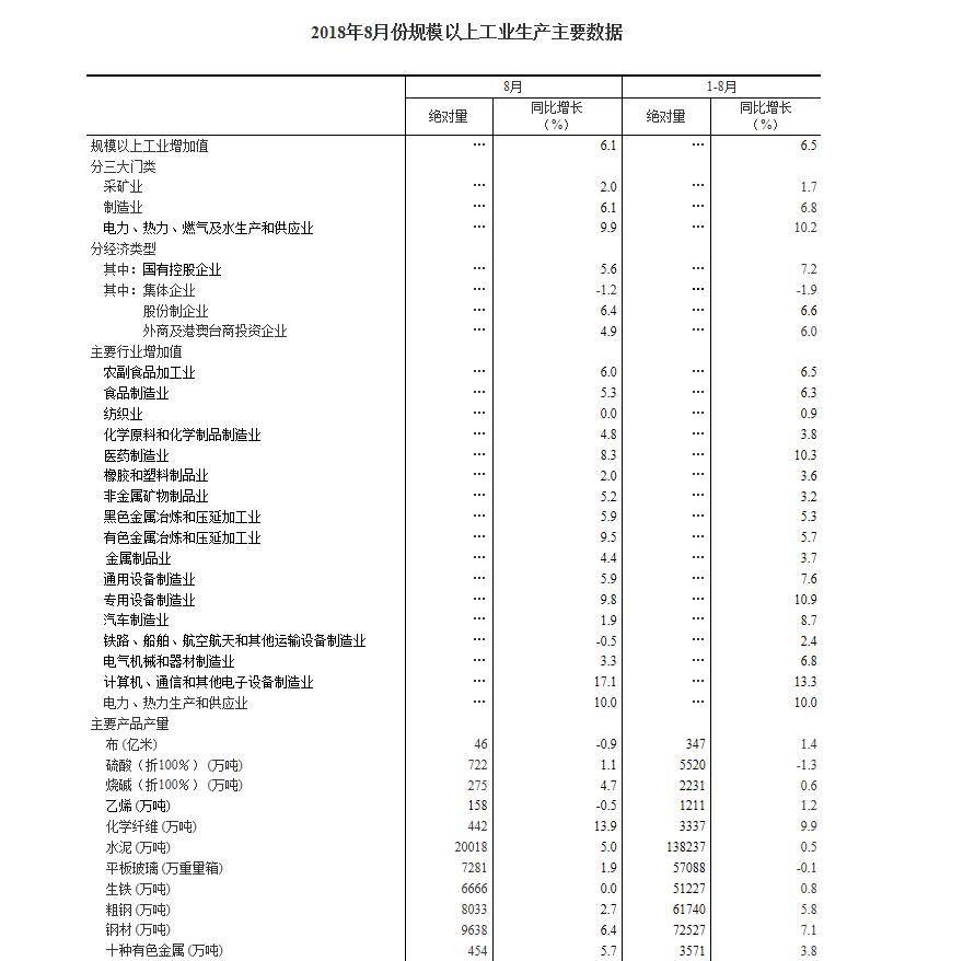 分行业看,8月份,41个大类行业中有36个行业增加值保持同比增长。其中,农副食品加工业增长6.0%,纺织业同比持平,化学原料和化学制品制造业增长4.8%,非金属矿物制品业增长5.2%,黑色金属冶炼和压延加工业增长5.9%,有色金属冶炼和压延加工业增长9.5%,通用设备制造业增长5.9%,专用设备制造业增长9.8%,汽车制造业增长1.9%,铁路、船舶、航空航天和其他运输设备制造业下降0.5%,电气机械和器材制造业增长3.3%,计算机、通信和其他电子设备制造业增长17.1%,电力、热力生产和供应业增长10.0%。