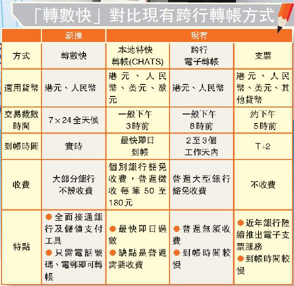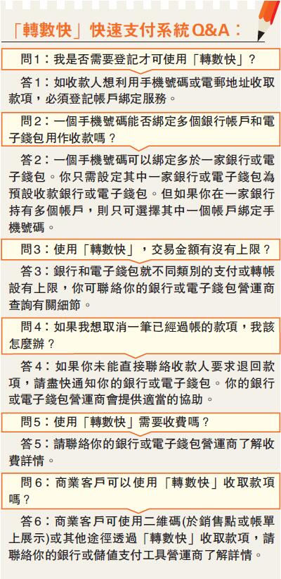 從昨日起,市民便可登記手機號碼或電郵,9月30日開始可使用這平台來轉帳、收款及支付。而即日起至本月底,參與機構會為「轉數快」作實境測試,直至30日正式全港通用,屆時已登記的用戶可透過手機錢包及網上銀行等方式,使用跨銀行及SVF即時轉帳。