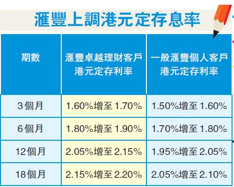 經上調後,汇豐卓越理財客戶的3個月港元定存息率為1.7厘、6個月為1.9厘、12個月為2.15厘、18個月為2.2厘。