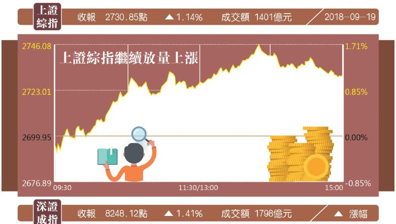 截至當天收盤,上證綜指報2730點,漲幅1.14%,成交1401億元人民幣;深證成指報8248點,漲幅1.41%,成交1798億元;中小板指報5627點,漲1.53%;創業板指報1392點,漲幅1.1%。