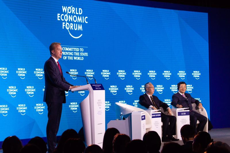 世界经济论坛总裁博尔格·布伦德宣布,下一届夏季达沃斯论坛将于2019年在大连举行。本报记者邢宝华摄