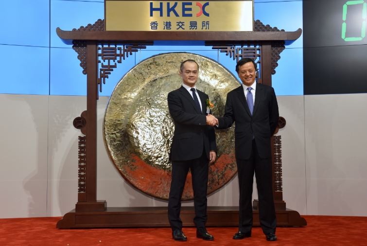 港交所行政总裁李小加(右)向美团点评联合创始人、董事长兼首席执行官王兴祝贺上市成功。中通社