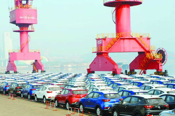 大批車輛停靠在江蘇連雲港港口碼頭等待裝船出口。 資料圖片