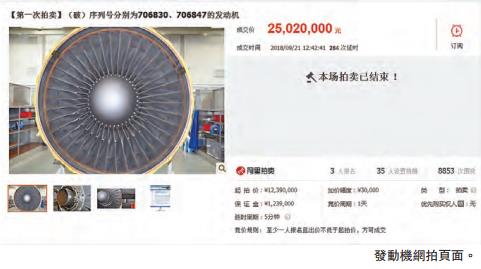 航空發動機網拍不僅在國際上十分鮮見,在內地更是首次。本次航空發動機拍賣從20日10時開始,一直競拍至21日中午將近1時。本次拍賣共3個競買者,除了深圳順豐航空公司,還吸引了美國的飛機發動機租賃公司Hartford Aviation Group和以色列物流公司ACE AVIATION III LIMITED。起拍價為1239萬元人民幣,經過281次出價,最終順豐航空公司以2502萬元人民幣的價格成功競得,溢價約102%。