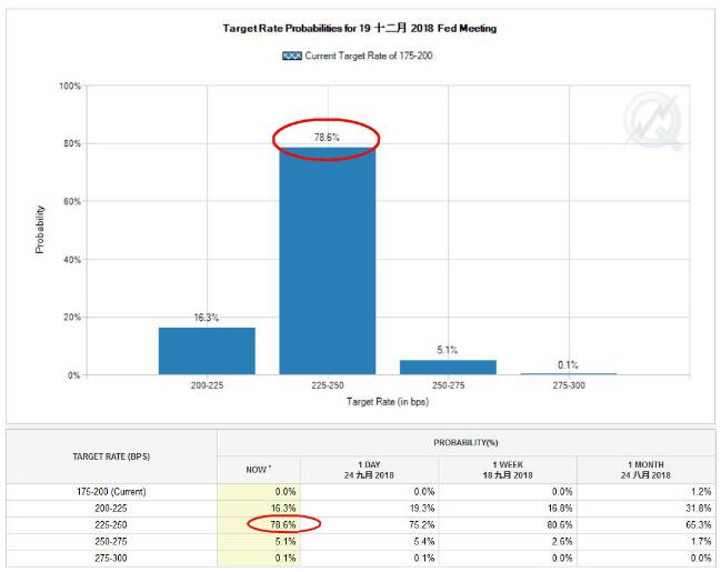 截至北京时间9月26日,芝加哥商业交易所(CME)的“美联储观察工具”显示,美联储今年12月加息25个基点至2.25%-2.5%概率为78.6%。