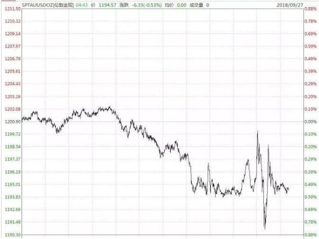 另外,现货黄金在声明发布后一度跌近0.9%,触及逾两周低位,但随后V型反弹8美元,跌幅一度缩窄至0.1%,重回1200美元上方,尾盘震荡走低,跌0.6%报1194美元/盎司。美国股市先涨后转跌,道指收跌106点或0.4%;标普跌0.33%,纳指跌0.21%;美债收益率短线走高,10年期国债收益率报3.0778%;离岸人民币短线反弹,盘中跌幅收窄至约0.11%。