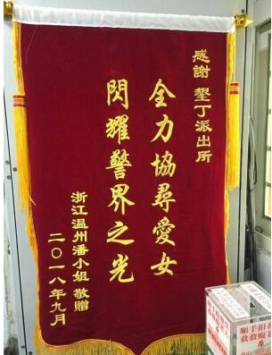 联络上爱女后,潘姓妇人心情才稳定下来,上周将一面大红锦旗寄到垦丁派出所表达谢意,锦旗还用繁体绣上“全力协寻爱女、闪耀警界之光”大字。