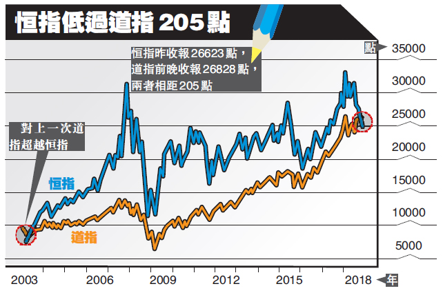 2003年4月28日,恒指收報8435點,低於道指的8471點,15年後的昨日,恒指以26623點收市,再次低於道指的歷史高位26828點。恒指低過道指,背後信號可以怎樣解讀?