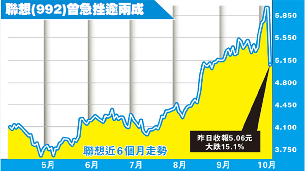 然而,假消息威力仍然強大,中美科技股一片哀嚎,蘋果、亞馬遜股價應聲下跌,Super Micro股價更是慘跌約四成。聯想昨股價一度瀉23%低見4.6元,創近10年來最大跌幅,收市仍跌15%報5.06元,成交額20.4億元。