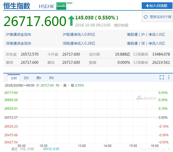 港股恒指则高开0.55%,报26717.60点。国企指数涨0.71%,报10605.15点。红筹指数涨0.74%,报4317.66点。大市盘前交易19.89亿港元。港股恒大健康(HK.0708)开盘大跌逾35%,随后跌幅收窄,截至上午10点,跌幅14.76%。恒指随着走低,截至11点30分,下跌0.85%。