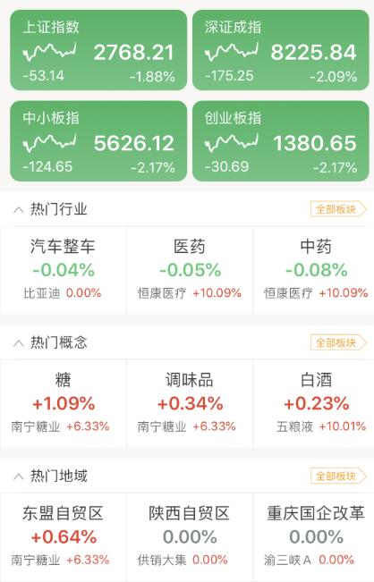 截至午间收盘,沪指跌2.95%报2738点,深成指跌3.09%报8141点,创业板指跌2.89%报1370点。