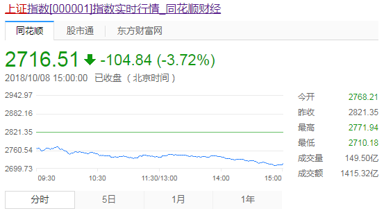下午两市未有起色,三大股指集体跌超3%,上证50跌超4%,两市翻红个股不到200只,超40只个股跌停。截止收盘,沪指报2716.51点,跌幅3.72%,深成指报8060.83点,跌幅4.05%;创指报1353.67点,跌幅4.09%。