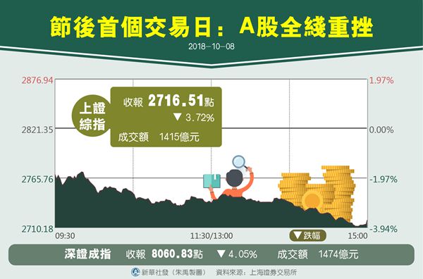 【香港商報网訊】國慶長假最後一天,人行突然釋放重磅利好,下調存款準備金率1個百分點,釋放約7500億元(約8600億港元)增量資金,然而這似乎並沒有挽救A股的頹勢。昨日,兩市行情萎靡,低開後持續低位運行,截至收盤,滬指報2716.51點,跌幅3.72%,創下6月19日以來的最大跌幅。;深成指報8060.83點,跌幅4.05%;創指報1353.67點,跌幅4.09%。分析認為,周一股市下挫是受到海外股市波動的影響,更重要的是降準並未對股市產生提振的原因最主要還是流動性目前並沒有形成較好的傳導機制,加上中美衝突的升級,使得市場信心不振。香港商報記者 伍敬斌 見習記者 廖非凡