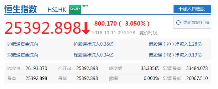 隔夜美股惨遭血洗,香港恒生指數低開3.1%,下破26000點,創15個月新低,之后跌幅持续扩大,截止午间收盘,恒生指数跌3.76%,国企指数跌4.1%;红筹指数跌3.68%。蓝筹股普跌。港股股王”騰訊控股開盤大跌4.3%,跌幅隨後擴大至逾6%,跌破270港元,市值下破2.6萬億港元。