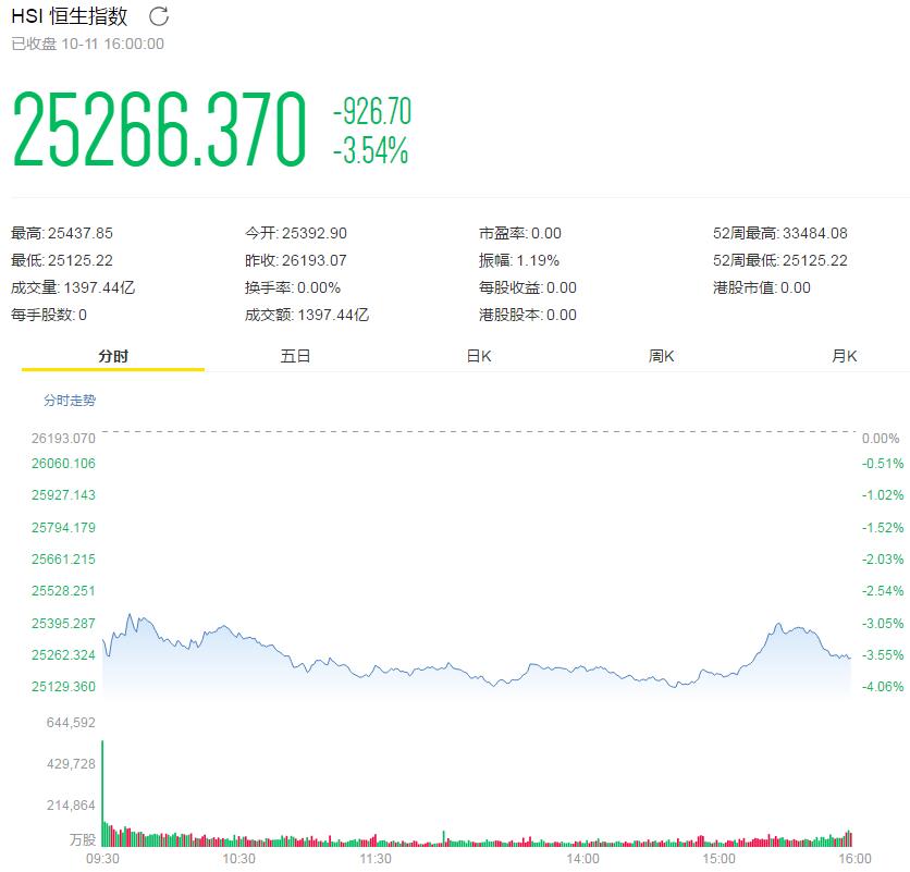 恒生指数午后一度跌逾4%。截止收盘,恒生指数跌3.54%,国企指数跌3.35%;红筹指数跌3.3%,逾500只港股创新低。