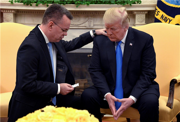 被土耳其释放的美籍牧师布伦森与特朗普会面时跪地祈祷。