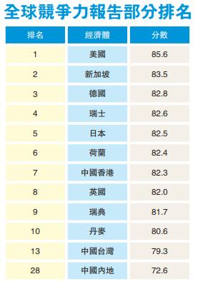【香港商報網訊】記者姚一鶴報道:世界經濟論壇(簡稱WEF)昨公布2018年度《全球競爭力報告》,美國重登榜首,是自2008至2009年金融海嘯以來首次。新加坡緊隨其後排第二,德國第三;香港則排第七名,較去年下跌一位。