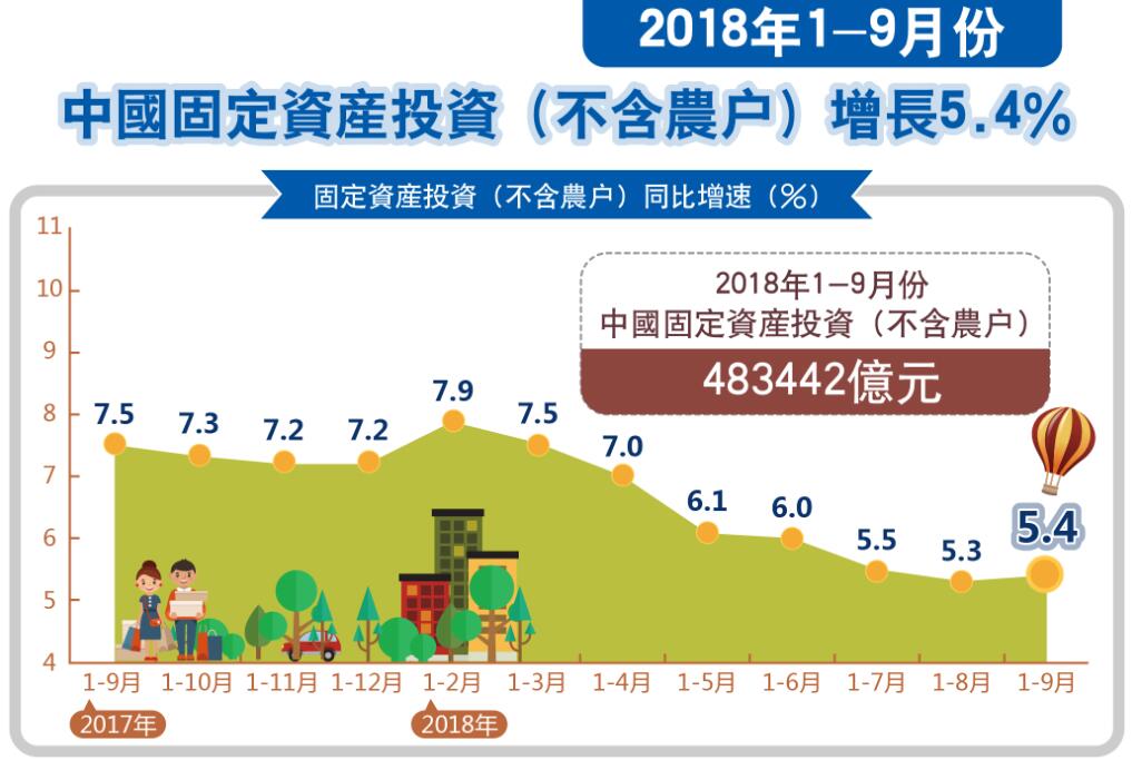 作為中國經濟「三駕馬車」之一的固定資產投資,前三季度為483442億元,同比增長5.4%,增速比上半年回落0.6個百分點,比1至8月份加快0.1%。