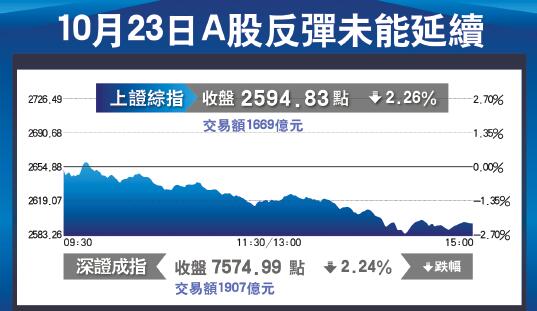 當日上證綜指以2652.65點小幅低開,早盤短暫翻紅並上摸2659.81點後開始震盪走低,午後跌破2600點整數位。截至收盤,滬指再度跌破2600關口,報2594.75,跌2.26%。深成指跌2.24%,報7574.99,創業板跌1.74%,報1292.06。中小板指數走勢疲弱,跌2.84%後以5114.42點報收。兩市成交額也從昨日超4200億跌至3575億。